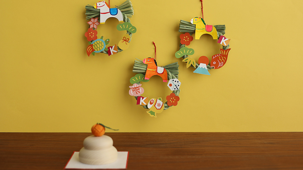 来年の干支「午(うま)」の飾りに自分で色を塗り、「開運招福」「健康長寿」「金運上昇」から好きなテーマの飾りを選び、しめ縄に取り付けます。