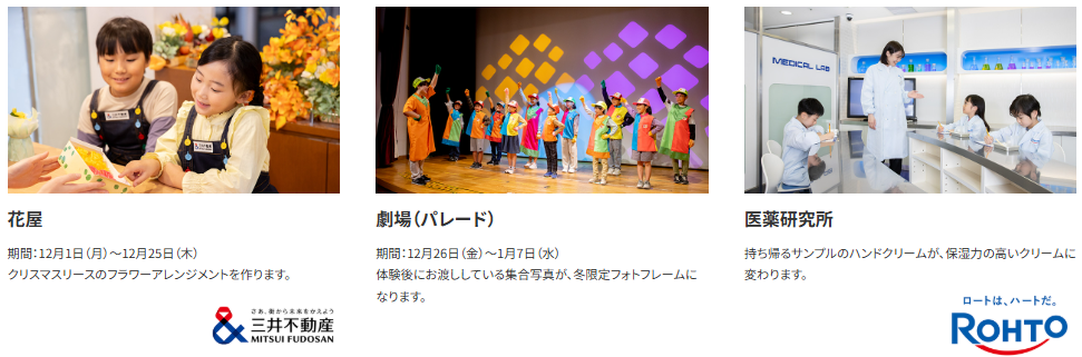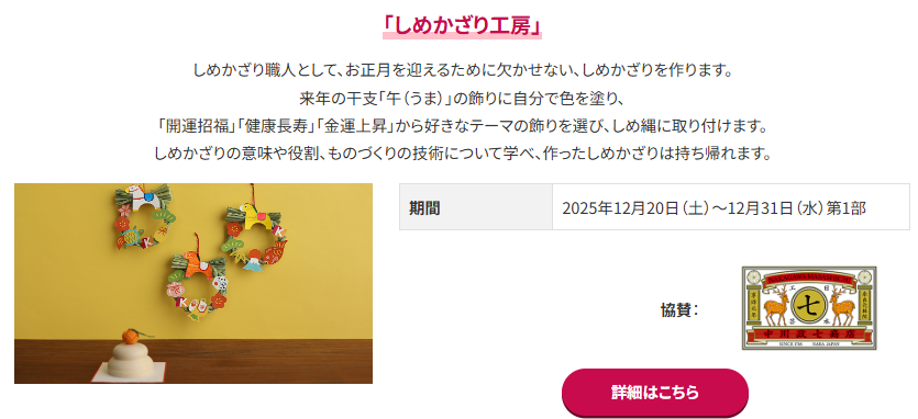 2025年12月はキッザニアウィンターが開催されます。またこの中には「しめかざり工房」があり、お正月用のしめかざりを作ることができます。