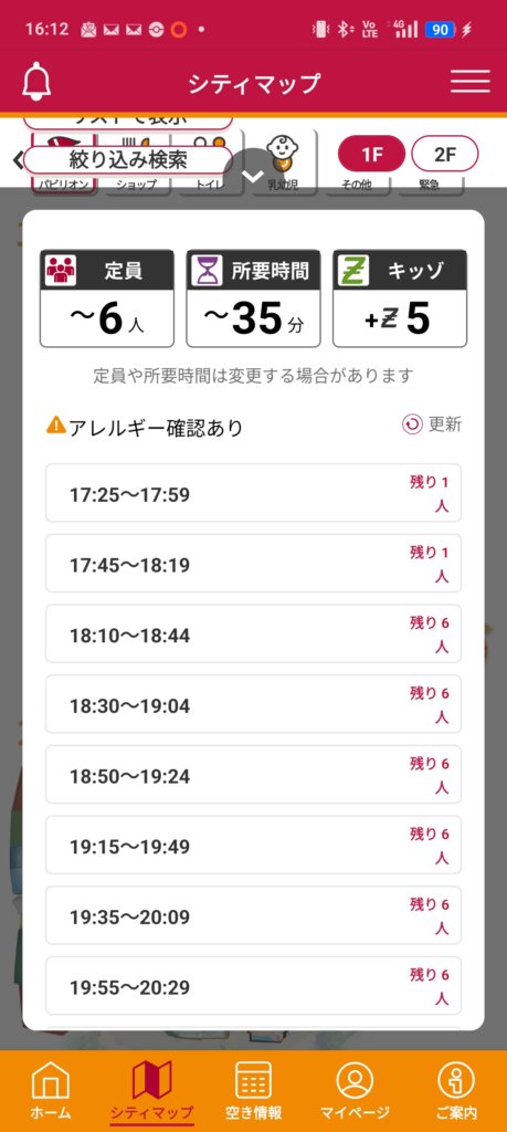 あくまでアプリの空き状況を私が見た時間での終了時間になりますが参考になりましたら幸いです。